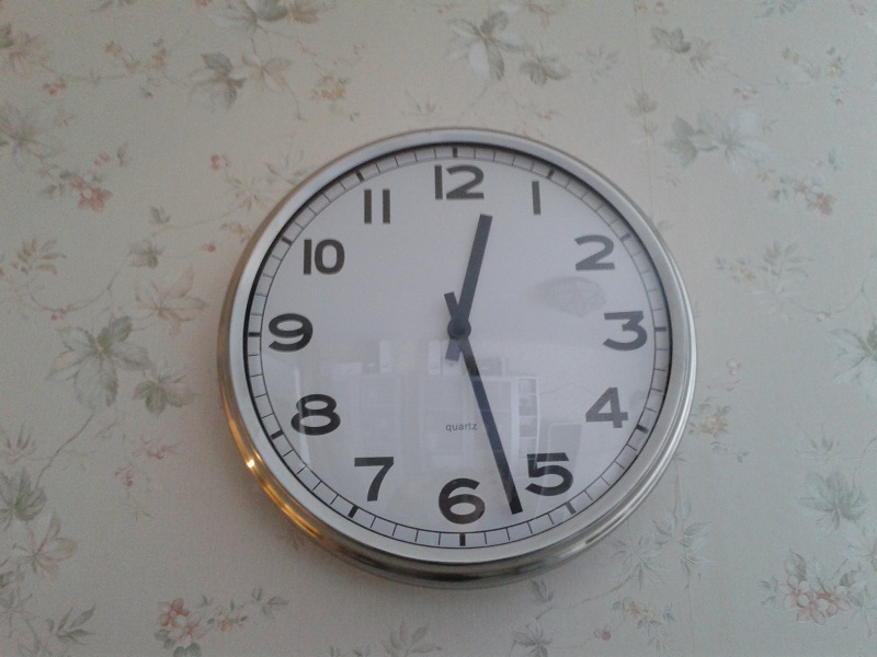Av samma anledning har jag numer också en stor och tydlig väggklocka ovanför datorn. Jag kan mycket väl läsa av digitala klockor och veta vad det är för tid, men jag har också lagt märke till att jag i huvudet omvandlar digitaltiden till en bild av en analog urtavla med samma klockslag, och att detta förstås är ett av de där extraklicken jag vill få bort ur mitt liv. Klockan har arabiska siffror eftersom romerska siffror, liksom sifferlöst, också skulle kräva viss översättning. Den tickar i och för sig lite högt, men fastän jag vanligen brukar störa mig på somliga ljud så har det här tickandet närmast lugnande inverkan.