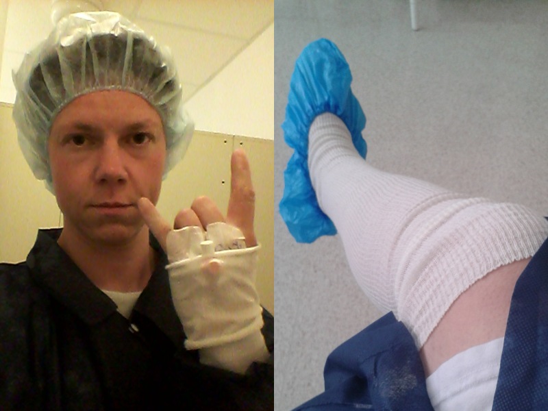 Ytterligare en Descutan-dusch på morgonen, nu utan ögonbehandling, sen drog vi till Samariterhemmet. Där fick jag fylla i blanketter, ta ett par värktabletter i förebyggande syfte (en långtidsverkande oxycodone som alltså är ett ”morfinliknande” preparat, samt en Alvedon av starkare sort än blasket apoteken har till allmän försäljning), vilket satt bra; jag hade börjat få huvudvärk, samt byta om till de fantastiskt tjusiga operationskläderna. Varför är de så mycket snyggare i amerikansk film?