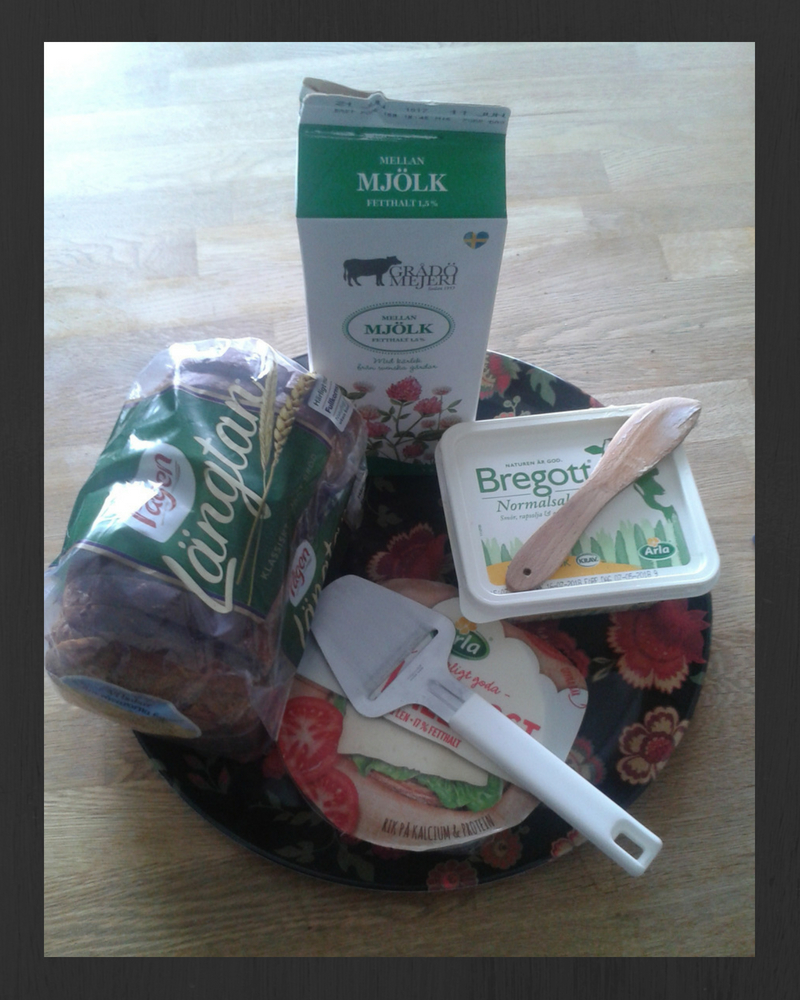 Men i alla fall. Hur kan en bricka till smör-mjölk-ost-bröd minska livets börda då? Jo förstår ni. Vårt kök är ett sånt där korridorskök. Bredvid kylen finns en arbetsbänk, och snett mittemot den är skafferiet. Från kylskåpet till bänken är det ett steg. Från bänken till skafferiet är det ett steg. Från den här lilla triangeln är det cirka sju steg till köksbordet.