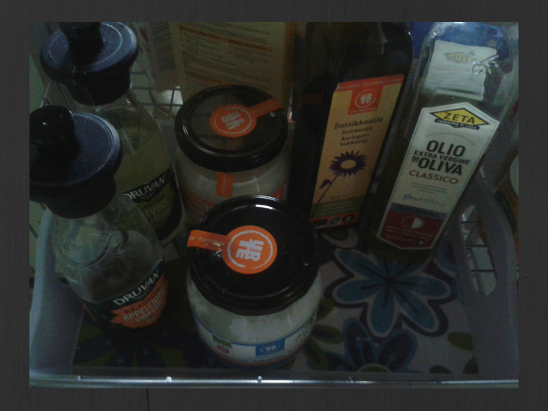 Fast för ett par år sen fick jag en snilleblixt efter att gått i taket igen över de satans oljeflaskorna och vinägerflaskorna i skafferiet som ramlar omkull så fort man så mycket som blinkar åt dem, eftersom hyllplanen är gjorda av metalltråd – jag tog en bricka och ställde alla flaskorna på. Makalöst klipskt.