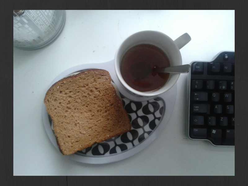Och så började jag använda en av mina snygga brickor att bära frukostkomponenter på från kylskåp till bord, för att minska antalet tankeprocesser som ofrånkomligen är kopplade till framdukande av frukost, och därmed göra frukostbestyren till ett mindre ångestframkallande moment, och ingen var väl lyckligare än brickan över att få vara till nytta.