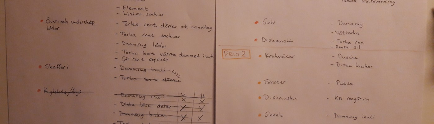 Det kan tyckas larvigt att skriva ner självklarheter och övertydliga instruktioner. Då vill jag påminna om att förutom att det är lättare för en själv, så underlättar det också för eventuella andra inblandade i julstädningen. Det som är ”självklart” är klart för en själv, inte för andra, var det nån som sa.